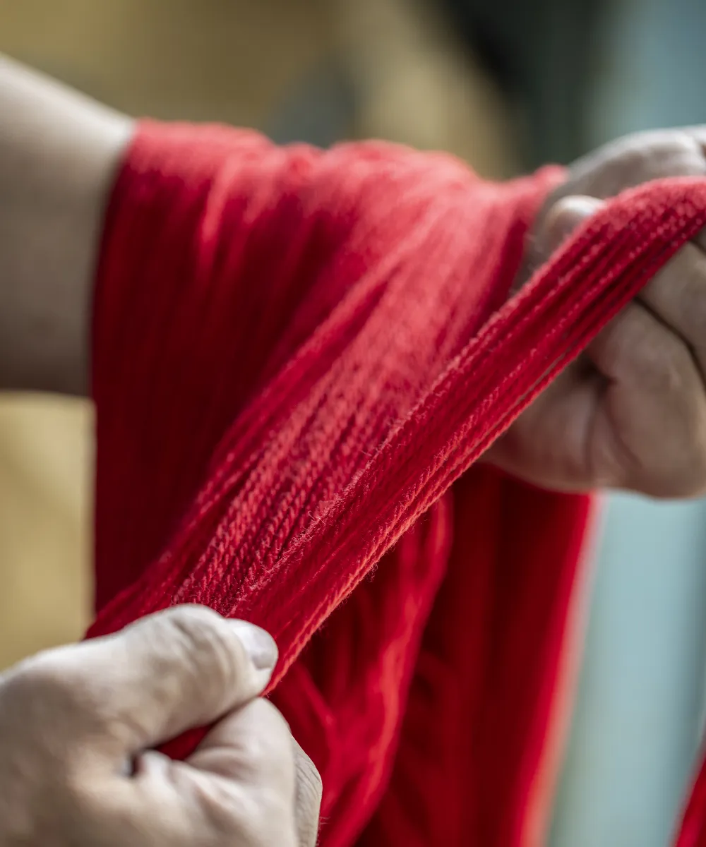 その日の気温や天候によって、色の出方は変わります。綿やウールなどの天然素材は、糸自体の品質にもバラツキが生まれます。それを感じ取るのは、人の眼や手です。五感を研ぎ澄まし、素材と向き合い続ける。職人たちにとって毎日がチャレンジであり、クリエイティブな時間なのです。