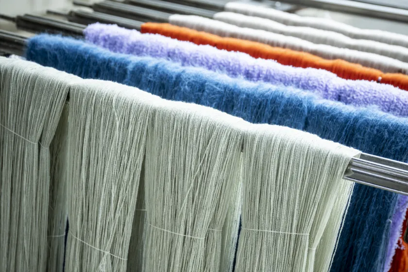 素材の品種ごとに一定の長さで巻き取られた糸の束――。これを「かせ」と言います。「かせ染め」は、コーン巻きの糸をほぐし、かせの状態になった糸束を作るところから始まります。