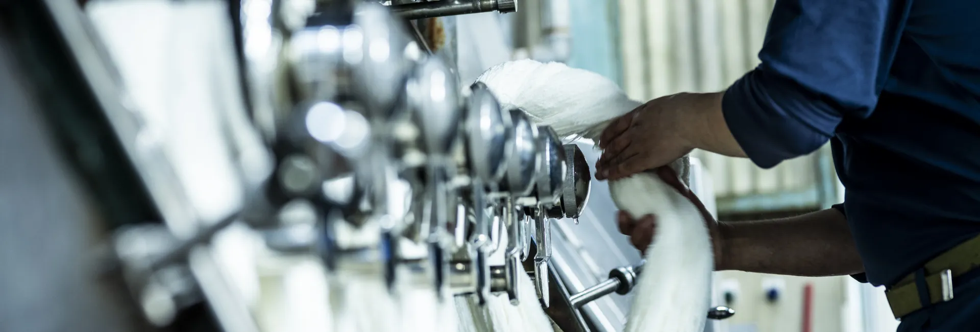 ウールをはじめとした天然繊維、合成繊維に幅広く対応。ストレートの糸はもちろん、さまざまな形状の意匠糸も手掛けており、アパレル用途だけではなく、産業資材用途の依頼もあります。また、大小さまざまな染色釜14台を備えているため、サンプルや小ロットの染色加工などに迅速に対応できるのも特徴です。