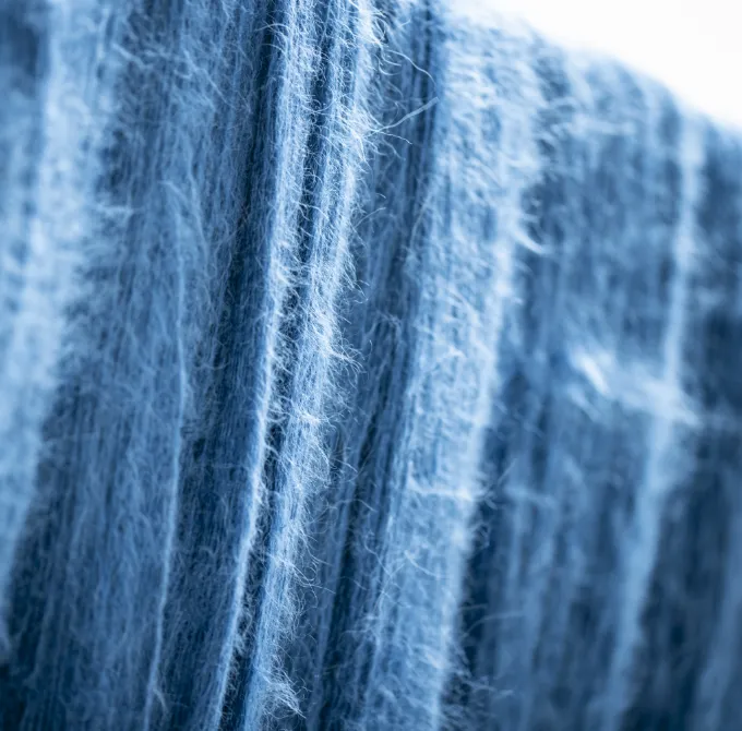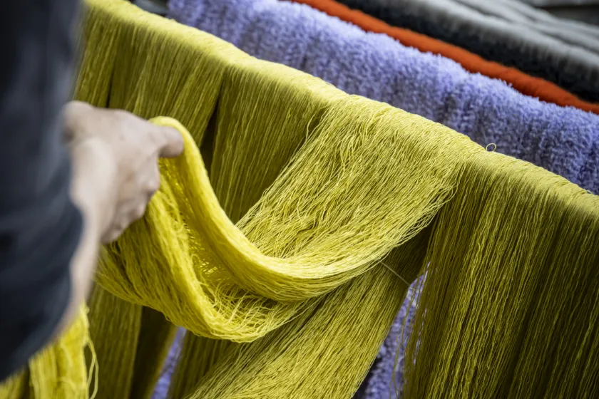 物理的に糸にストレスがかからない染色手法と、手しごとが相まって出来上がる糸の風合い――。この素材が持つ本来の風合いを最大限に引き出すことで、人の手の温かさが感じられる唯一無二の膨らみのある糸に仕上がります。
